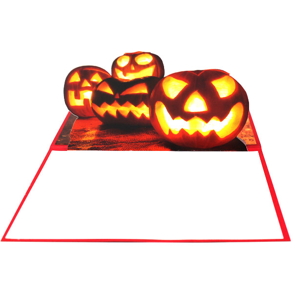 Organizirate li savršeno strašan tulum za Noć vještica, ova će Vam pozivnica pritom zajamčiti dašak jezovite originalnosti. Naslovnica je krvavo crvene boje, unutrašnjost se sastoji od 2D prikaza nacerenih bundeva koje ne garantiraju ništa “dobro”. Iza bundeva je printana podloga sa krvavim natpisom “Happy Halloween”.