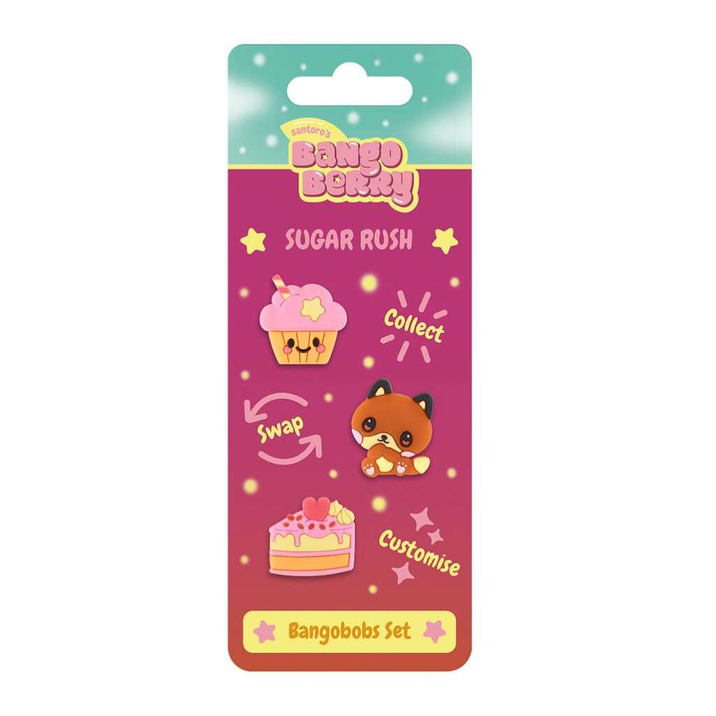 Bangobobs – sakupite, zamjenite i uredite po svom ukusu! Set 3 komada gumenih privjesaka koji se mogu stavljati i skidati s vaših Bangoberry artikala. Kombinirajte svoje omiljene kako biste odrazili svoju osobnost, nadahnuli vaše snove i potaknuli dobre vibracije. Kolačić – jednostavno neodoljiv, Foxington – hajdemo u avanturu, Kriška torte od jagode – sladokusac.
