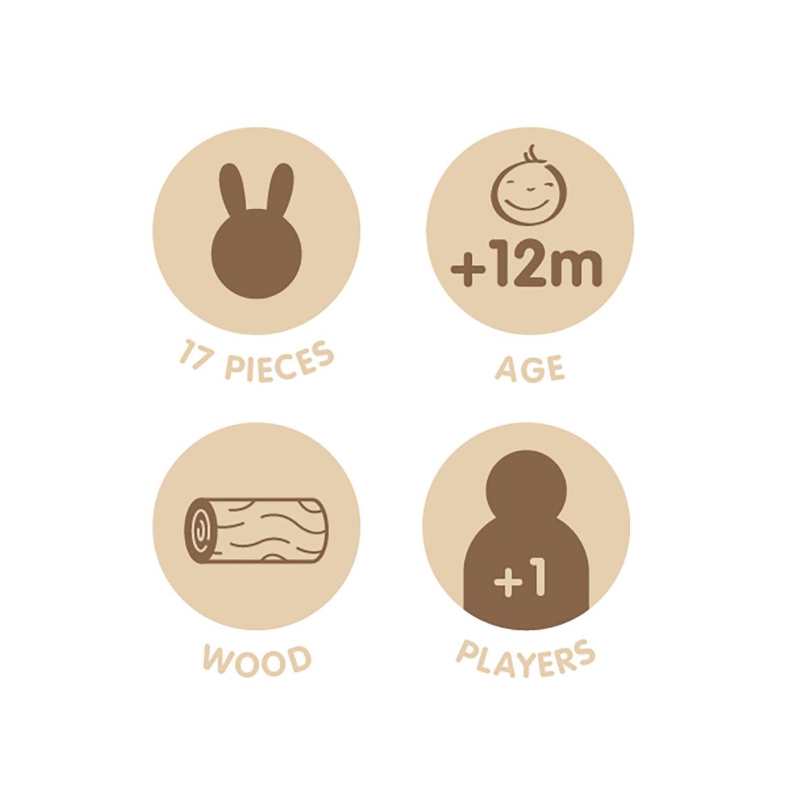 Drvena edukativna igračka Rabbit (Zeko) koja sadrži 17 geometrijskih tijela, zaobljenih rubova i drvenu kocku s odgovarajućim otvorima i poklopcem za pražnjenje. Potiče razvoj fine motorike, logike i vizualne koordinacije. Za uzrast od 12 mjeseci.