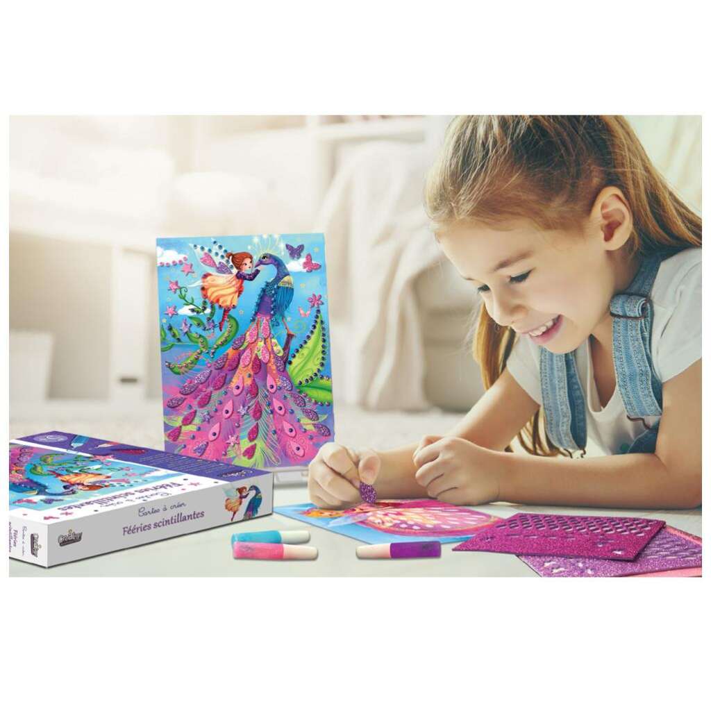 Za sve ljubitelje glitera! Djeca mogu ukrasiti slike i učiniti ih svjetlucavima koristeći oblike i olovke sa gliterima. Dijete će odlijepiti unaprijed izrezane oblike gliter naljepnica kako bi ih stavilo na kartice. Zatim će koristiti gliter olovke za finalizaciju svoje kompozicije. Također mogu pokazati svoje slike koristeći priloženi štafelaj. Zahvaljujući ovom setu dijete će moći razviti svoju kreativnost i spretnost.
